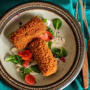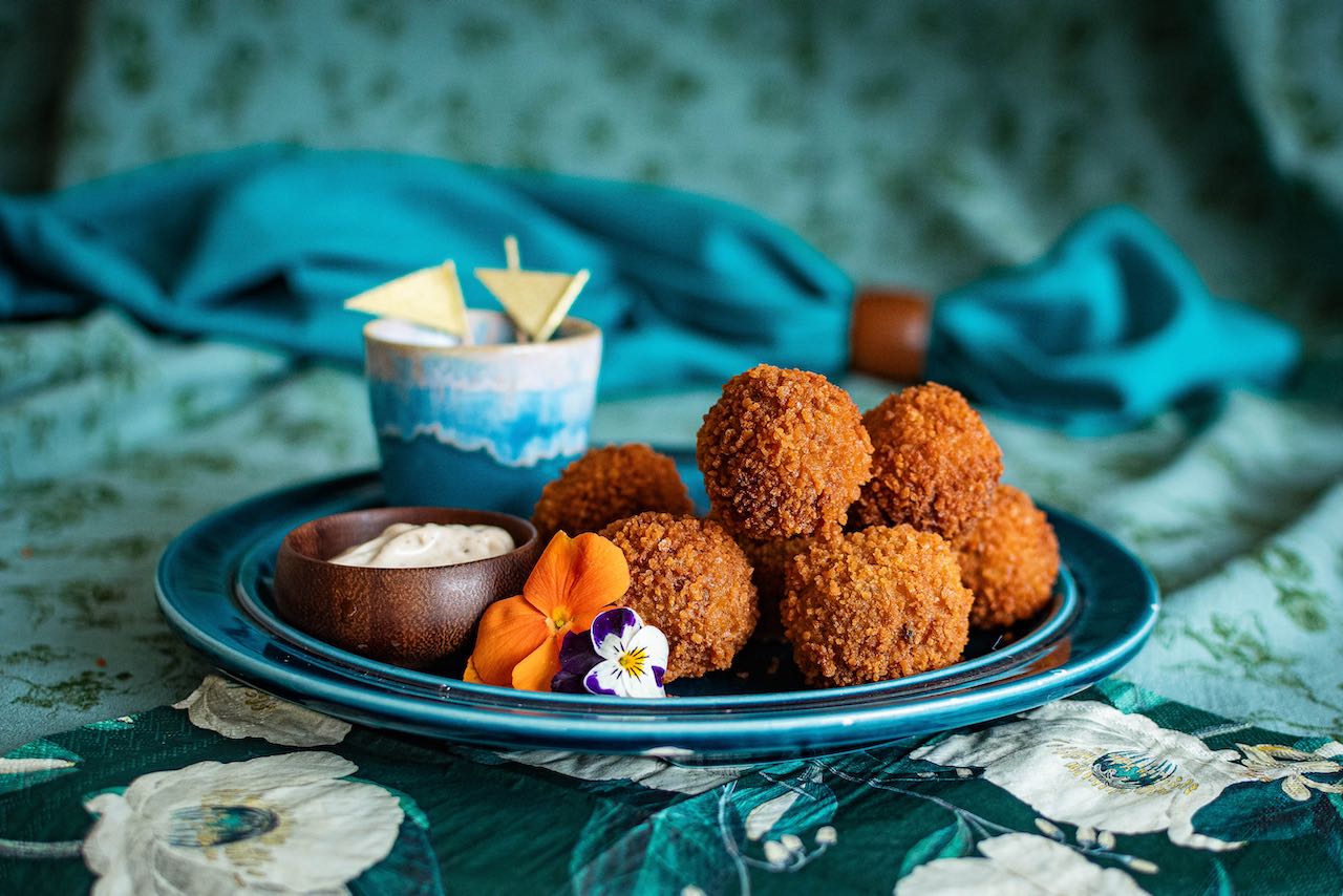 Onze circulair op koffiedik gekweekte plantaardige oesterzwam bitterballen komen van de Rotterdamse banketbakkerij van der Heijden. Lid van het Patisserie College, het Gilde van de betere banketbakkers!